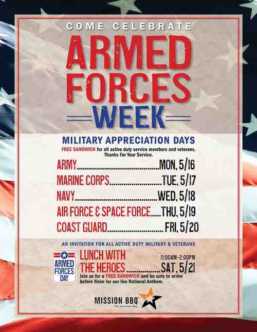 Each May, Mission BBQ hosts a week-long tribute to the U.S. Armed Forces. During this celebration, each military branch is honored on its own dedicated day, and service members receive a free sandwich to show appreciation for their commitment and sacrifice. The schedule usually follows this pattern: